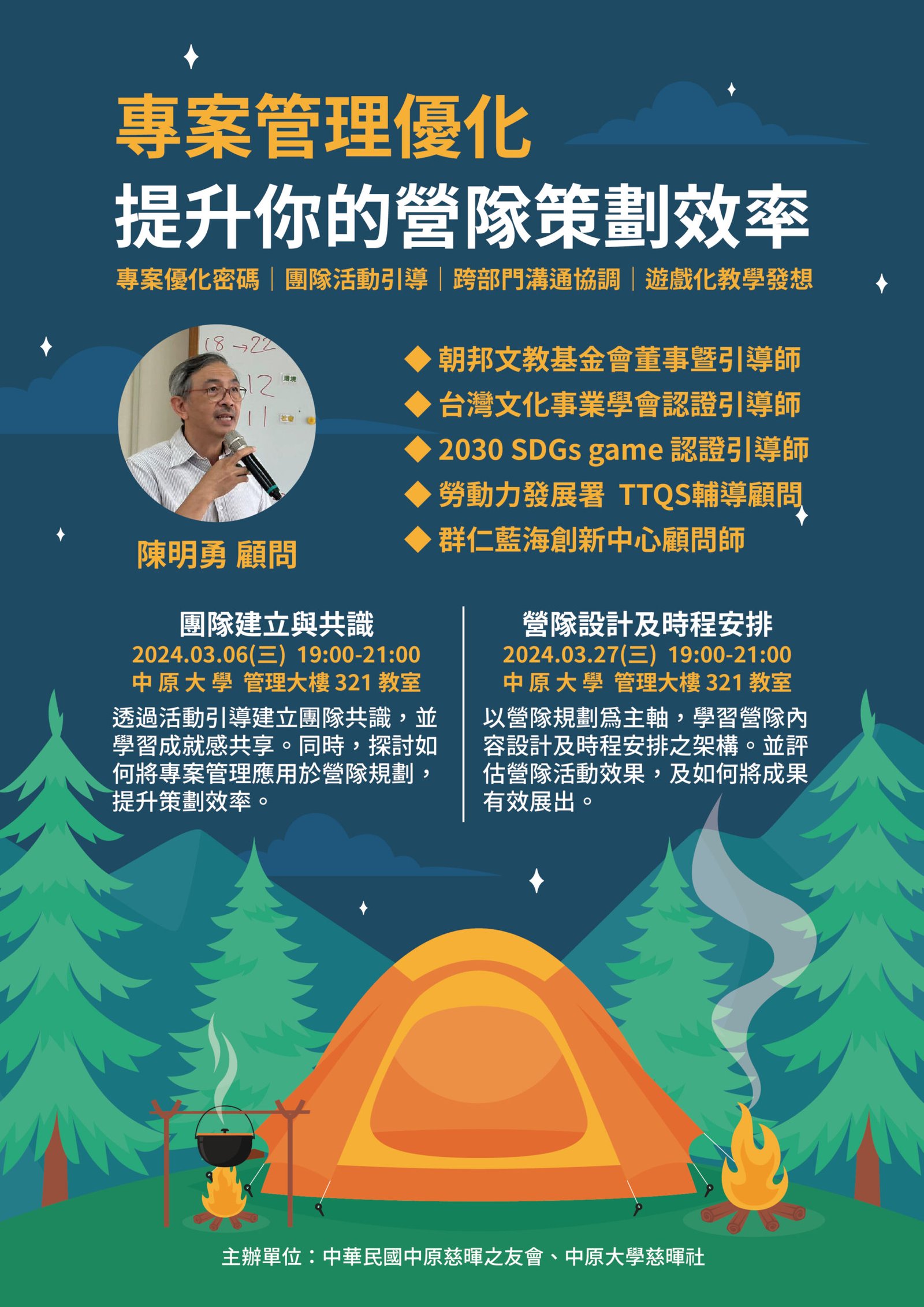 25 2 月 24 敬邀出席全人教育課程-專案管理優化 提升你的營隊策劃效率 No Comments 📢本會會員獨家限定‼️ 全人學習課程即將開課啦~ 為了能提供中原慈暉社學弟妹 更多、更好、更重要的學... 查看更多